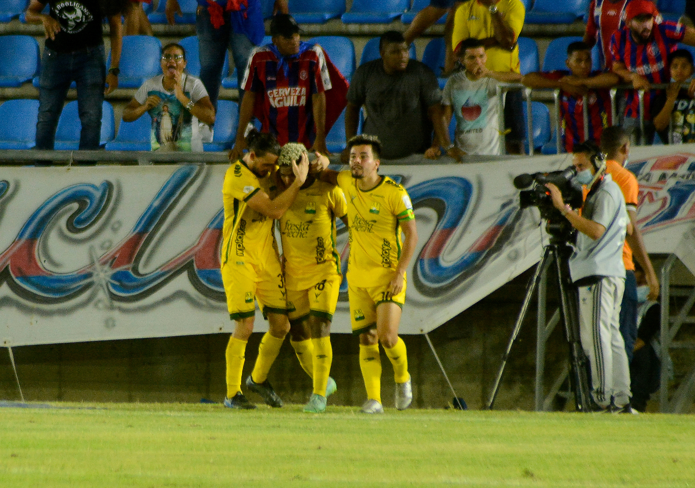 Jugadores de Atlético Bucaramanga celebran el gol anotado al Unión Magdalena durante partido entre Unión Magdalena y Atlético Bucaramanga de la fecha 7 por la Liga BetPlay DIMAYOR I 2022, en el estadio Sierra Nevada de la ciudad de Santa Marta. Foto: VizzorImage / Gustavo Pacheco / Cont.