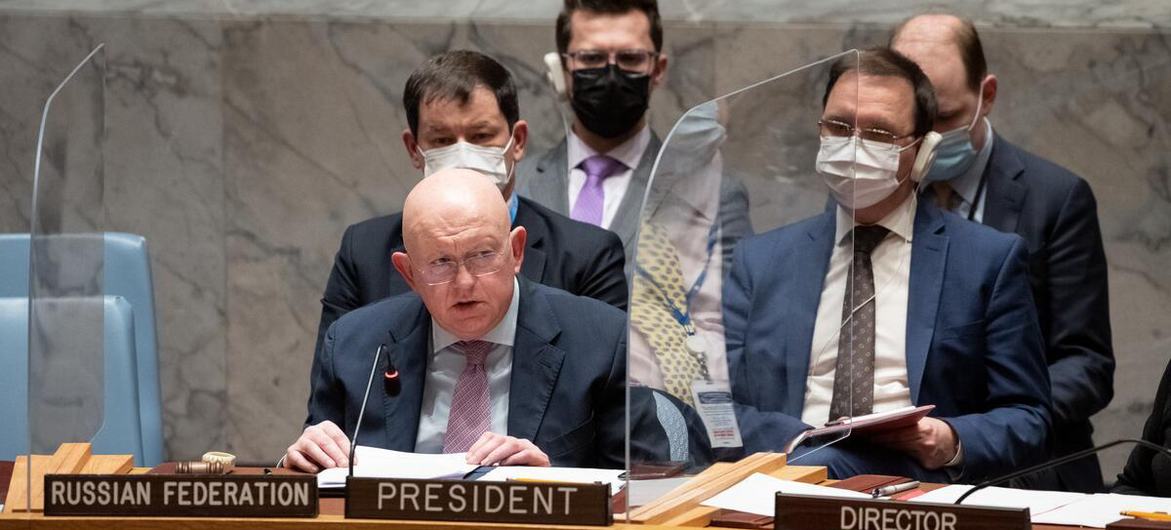 El embajador de Rusia, Vasily Nebenzya, durante una sesión del Consejo de Seguridad sobre Ucrania.