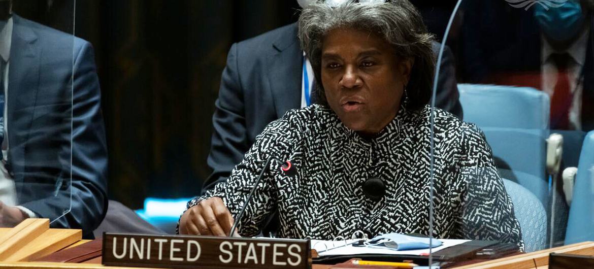 La representante permanente de Estados Unidos ante las Naciones Unidas, Linda Thomas-Greenfield, se dirige a la reunión del Consejo de Seguridad sobre la situación en Ucrania.