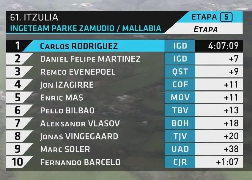 Los españoles Ion Izagirre (Ineos), Enric Mas (Movistar) y Pello Bilbao (Bahrain), cuarto, quinto y sexto a 11, 11 y 13 segundos, se mantienen como candidatos para ganar una carrera en la que cedieron opciones Alexandr Vlasov (Bora) y Jonas Vingegaard (Jumbo), séptimo y octavo a 18 y 20 segundos, porque tuvieron que entrar andando al caerse de la bici en el tremendo repecho final.