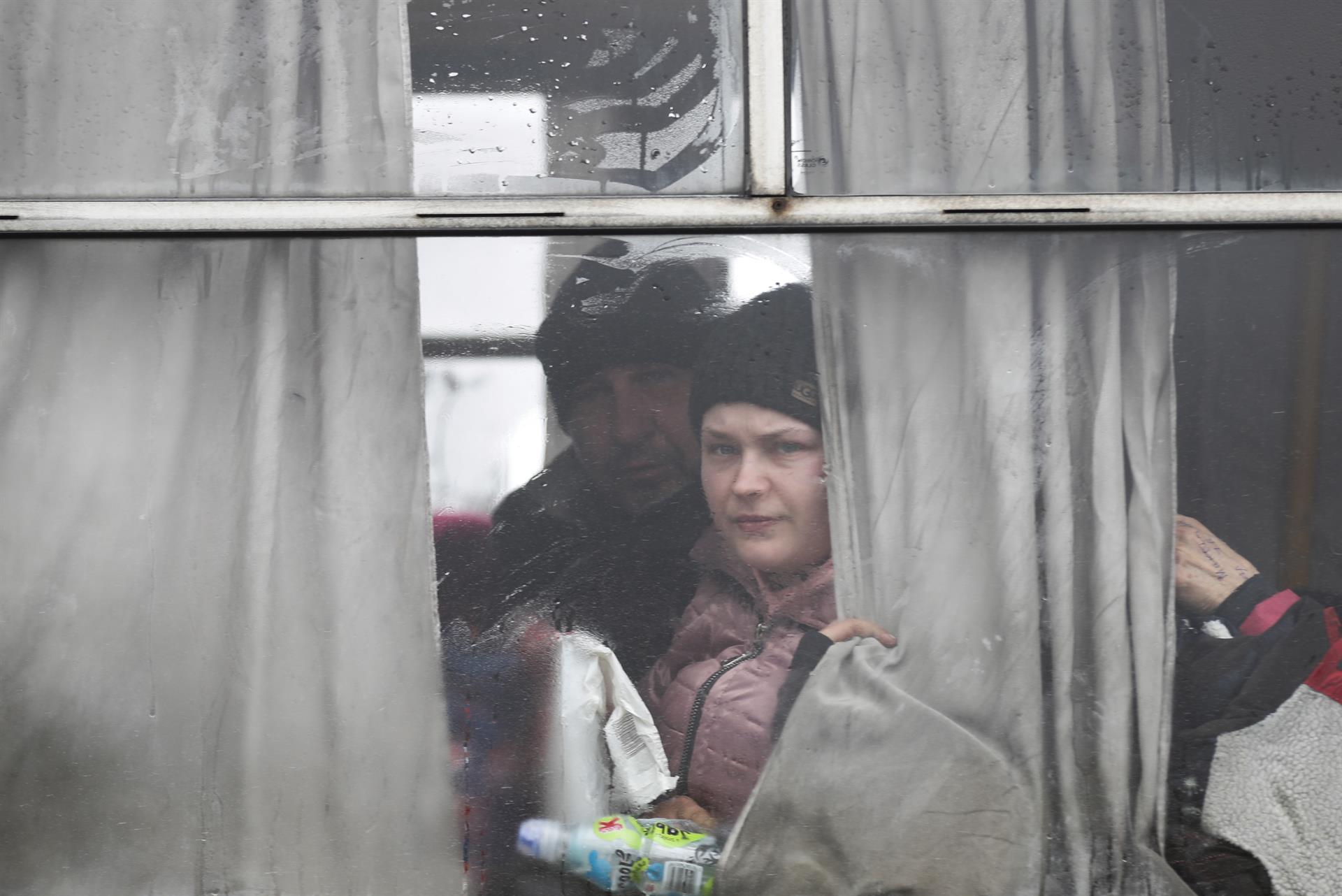 Refugiados ucranianos miran desde un autobús cuando salen de la ciudad de Bucha, Ucrania, el 03 de abril de 2022. Dmitrivka y el área alrededor habían sido recientemente recapturados por el ejército ucraniano de las fuerzas rusas. EFE/EPA/ATEF SAFADI