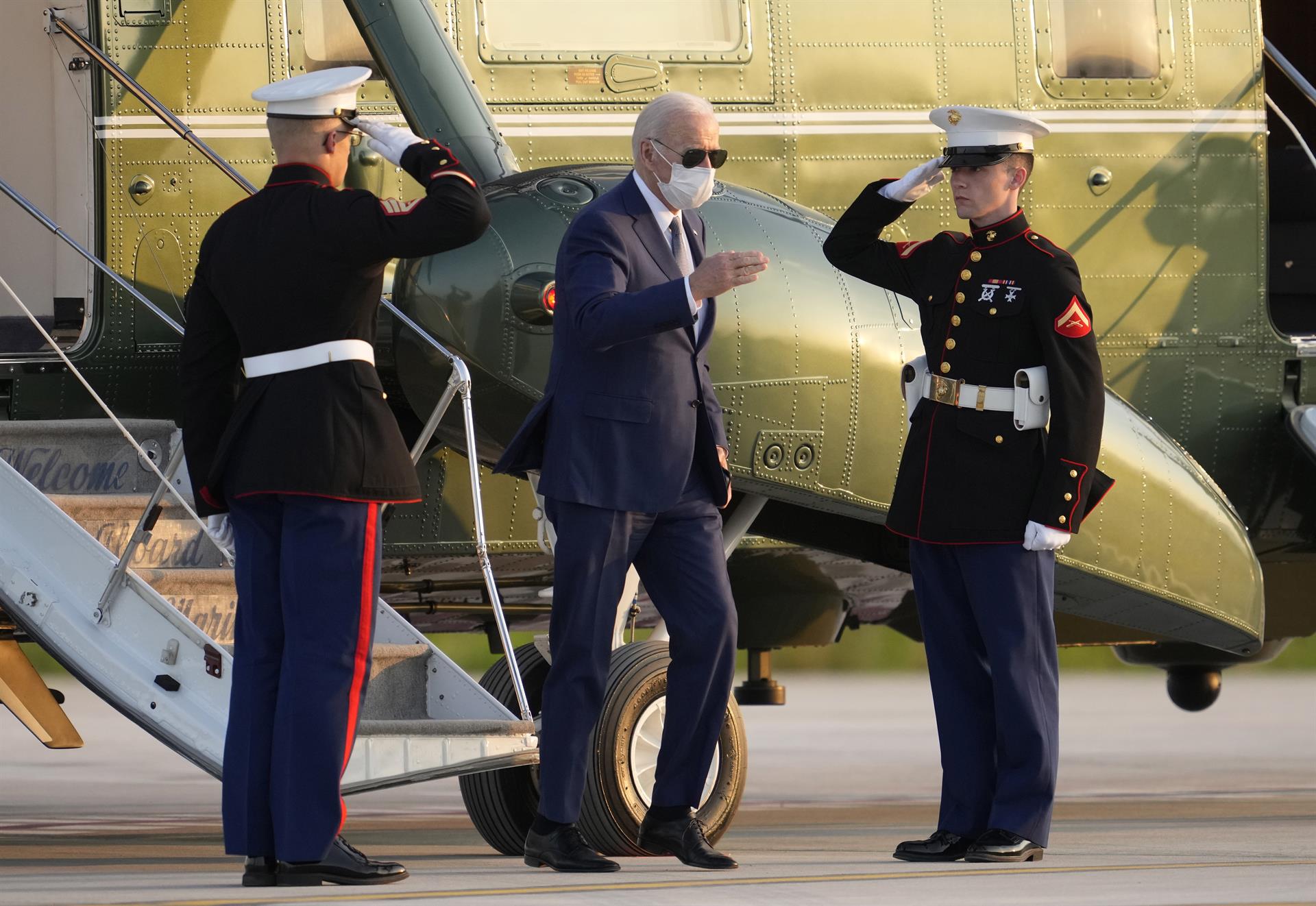 El presidente de los Estados Unidos, Joe Biden (C), desembarca el Marine One para abordar el Air Force One en la base aérea de Yokota en Fussa, Tokio, Japón, el 24 de mayo, gira por Asia que comenzó en Corea del Sur. (Japón, Corea del Sur, Estados Unidos, Tokio) EFE/EPA/KIMIMASA MAYAMA