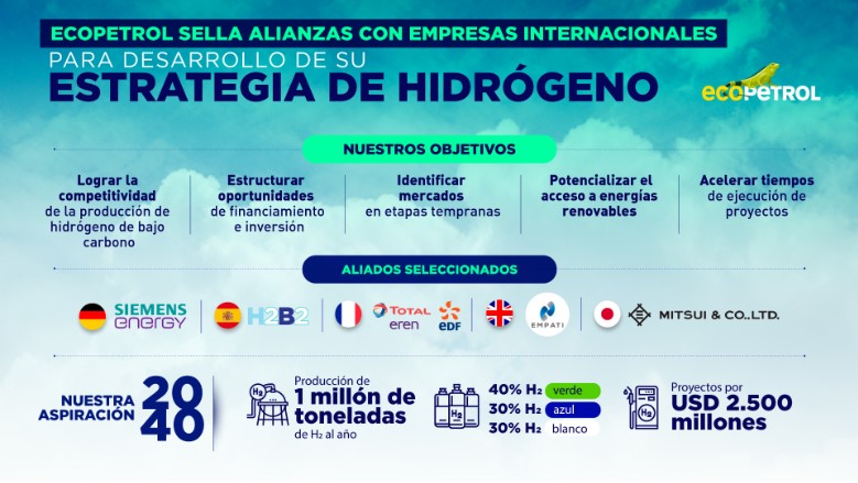 Davos (Suiza), 23 may (EFE).- Las francesas Eren y EDF, la española H2B2, la alemana Siemens, Empati de Reino Unido y Mitsui de Japón fueron las seis empresas seleccionadas por la petrolera estatal colombiana Ecopetrol para desarrollar proyectos de hidrógeno verde.
