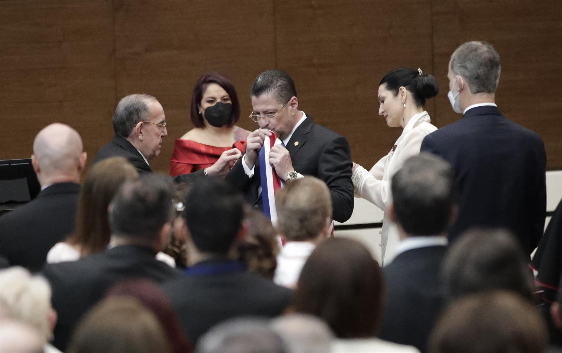 El presidente saliente Carlos Alvarado entregó la banda presidencial y de inmediato Chaves recibió la suya, con lo que quedó oficializado como mandatario.