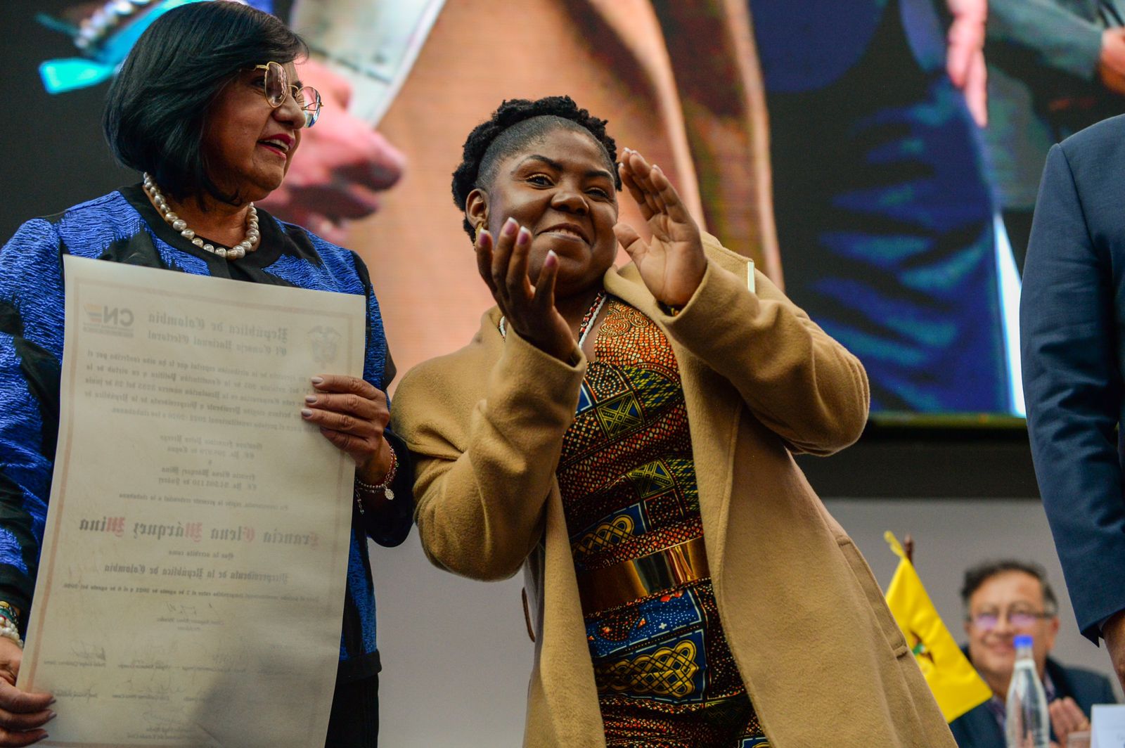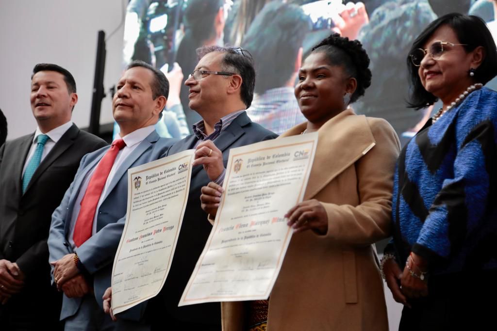 Bailando unos segundos al ritmo de sonidos del Pacífico, Francia Márquez recibió primero la credencial como vicepresidenta de Colombia de manos de la magistrada Doris Ruth Méndez Cubillos, única mujer del CNE, quien consideró un «honor inmenso» entregar el documento «a la primera mujer afrodescendiente en ocupar el cargo».