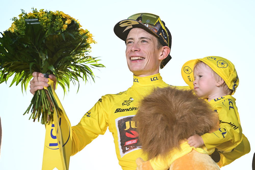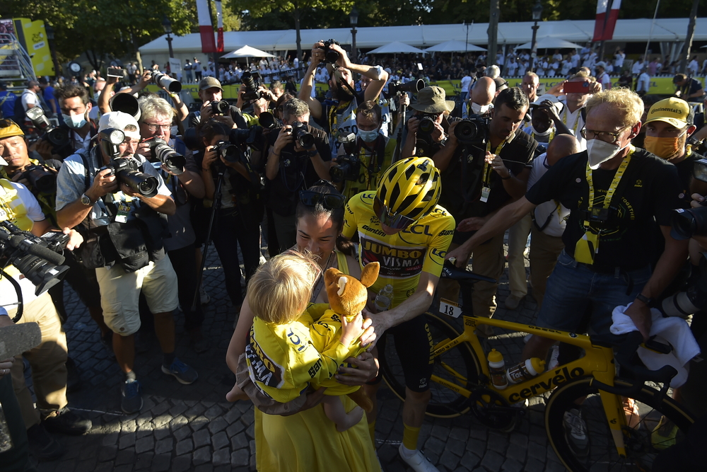 Con su mujer, Trine Marie, y su hija, celebró el triunfo virtual tras la crono del sábado, y ya en París de manera oficial, y escuchó el himno danés escoltado en el podio por el esloveno Tadej Pogacar (UAE), ganador de las dos ediciones anteriores, y el galés Geraint Thomas (Ineos), otro vencedor del Tour (2018).