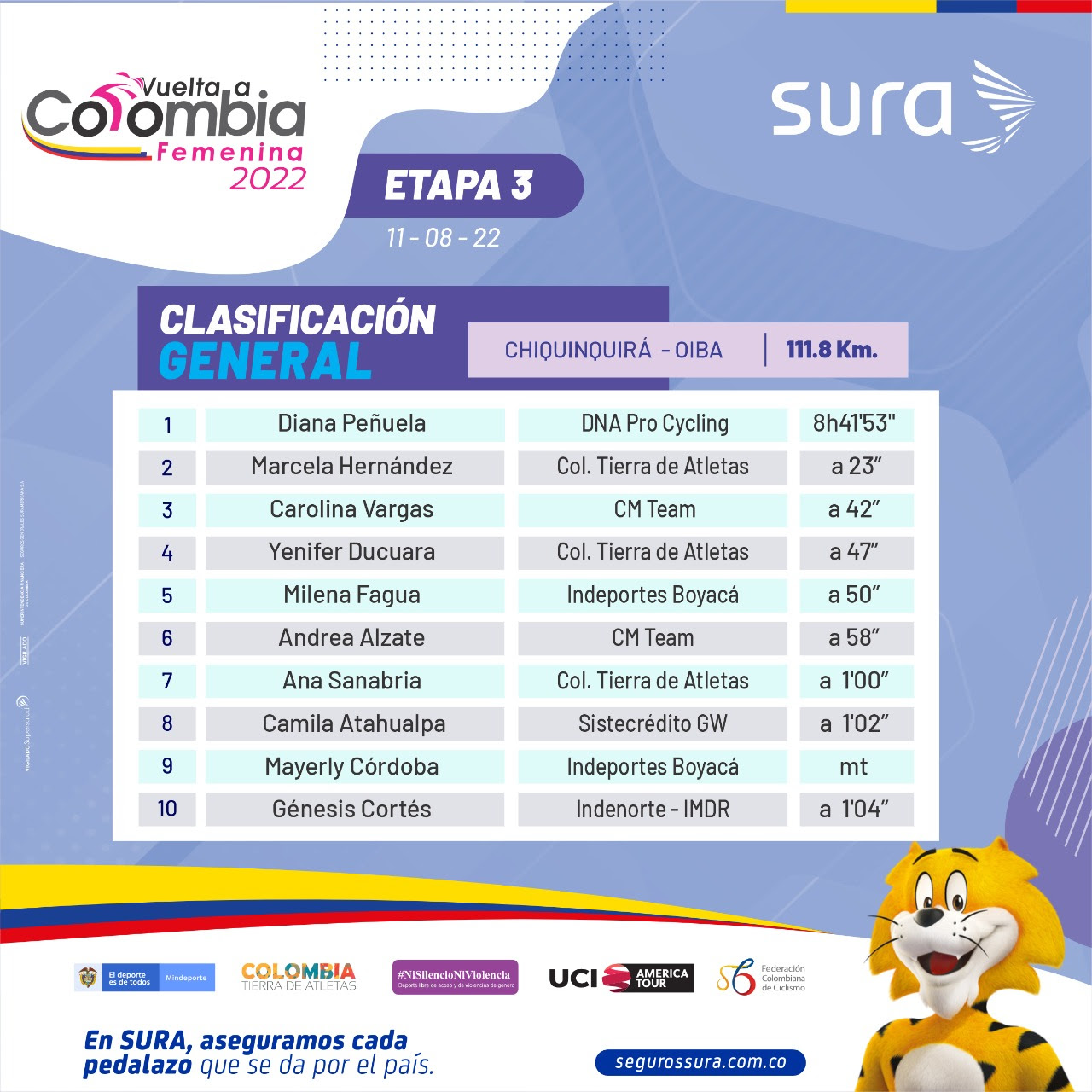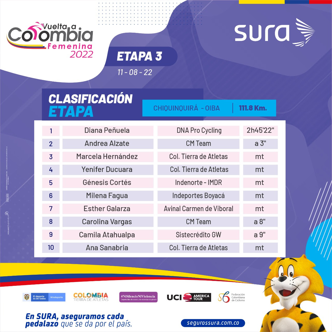 Detrás de Diana Peñuela arribó Andrea Alzate (CM Team) y en el tercer lugar finalizó Lina Marcela Hernández, ambas a 2 segundos de la líder.
