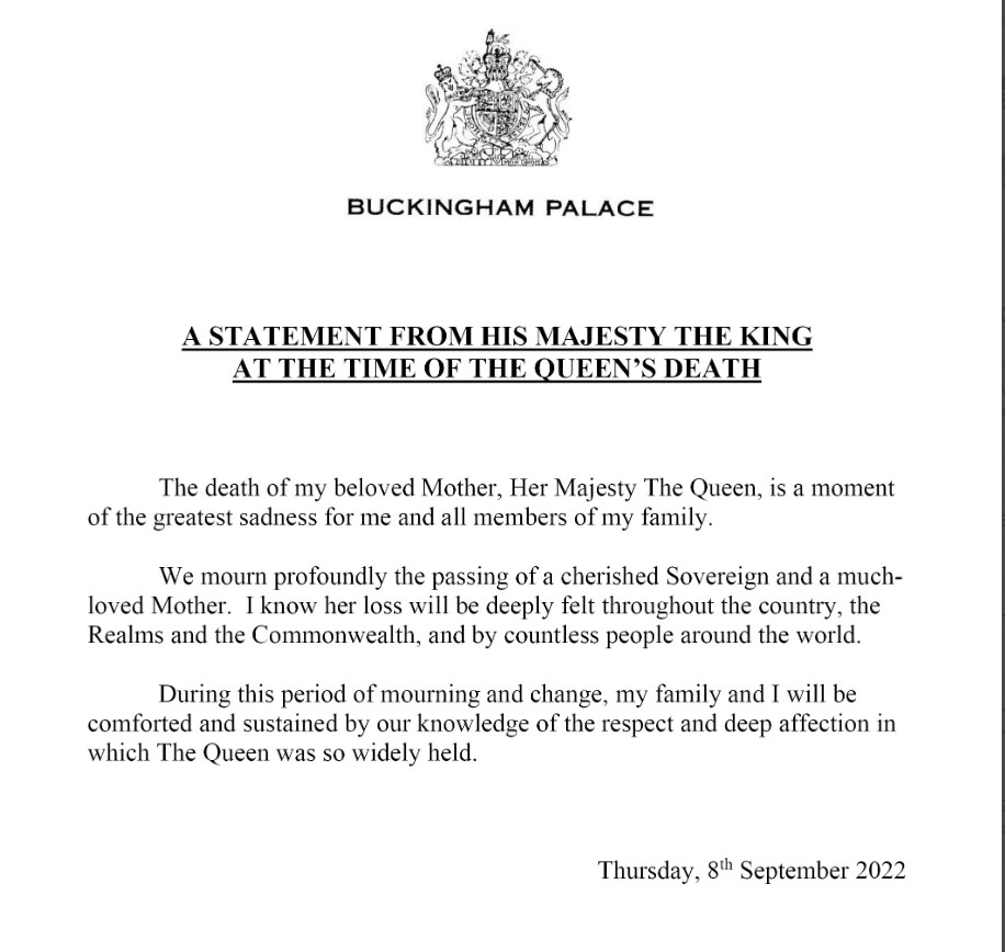 El primer comunicado de Carlos III como rey de Inglaterra tras la muerte de su madre, la reina Isabel II