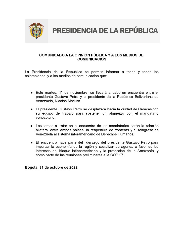 Este martes, 1° de noviembre, se llevará a cabo un encuentro entre el presidente Gustavo Petro y el presidente de la República Bolivariana de Venezuela, Nicolás Maduro.
