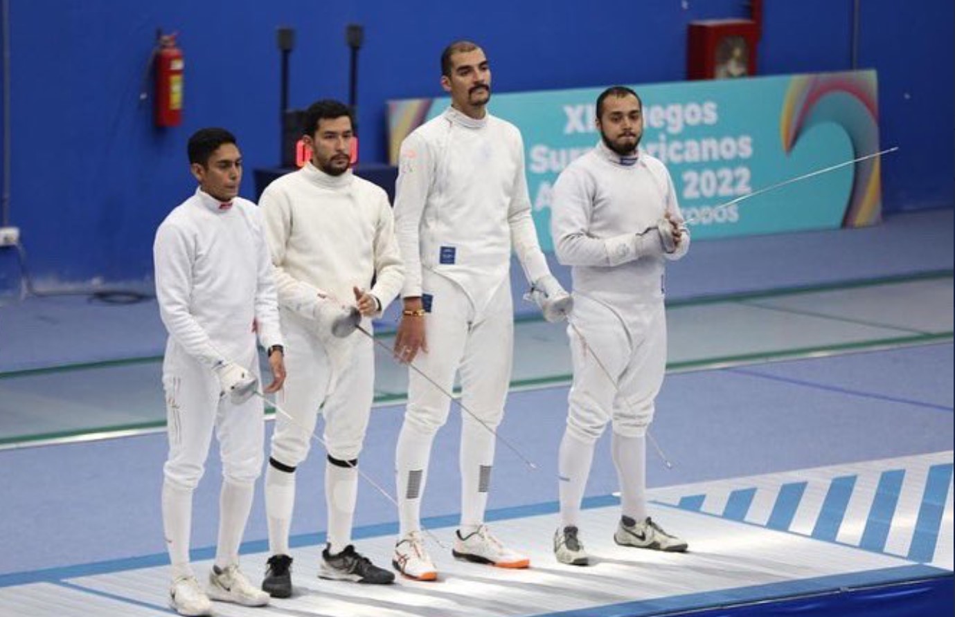 John Rodríguez, Michael Lozano, Jorge Murillo y Hernando Roa, ganaron la medalla de oro en la esgrima, espada por equipos masculino, tras derrotar a Brasil 45-44 en los XII Juegos Suramericanos @asu2022oficial