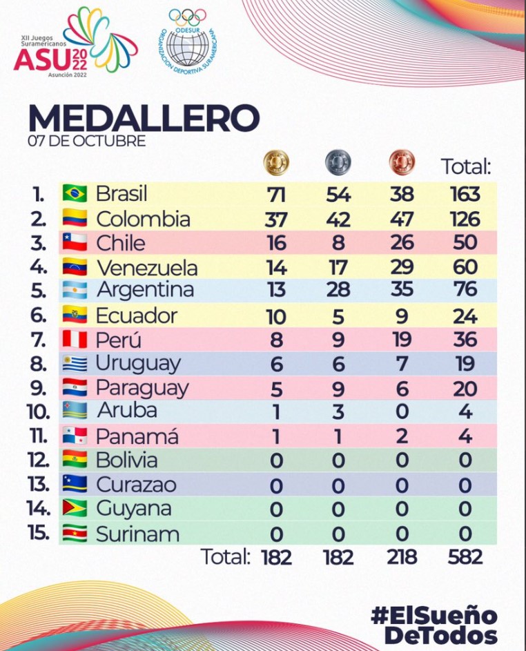 Asunción, 07 octubre,2022_RAM_ Cuatro medallas de oro, tres de plata y seis de bronce fue el balance que tuvo Colombia en el séptimo día de competencias de los Juegos Suramericanos de Asunción 2022. Sumatoria que lo afianza en el segundo Iugar de la tabla de medallería, por detrás de Brasil, que llegó a un total 163 metales (71 oros, 54 platas y 38 bronces).