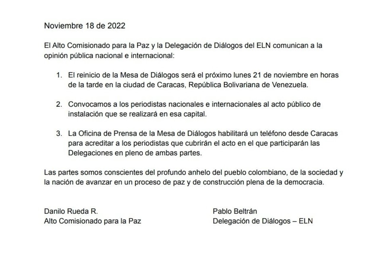 “El reinicio de la mesa de diálogos será el próximo lunes 21 de noviembre en horas de la tarde en la ciudad de Caracas, República Bolivariana de Venezuela”, dice uno de los puntos del comunicado de la Oficina del Alto Comisionado para la Paz.