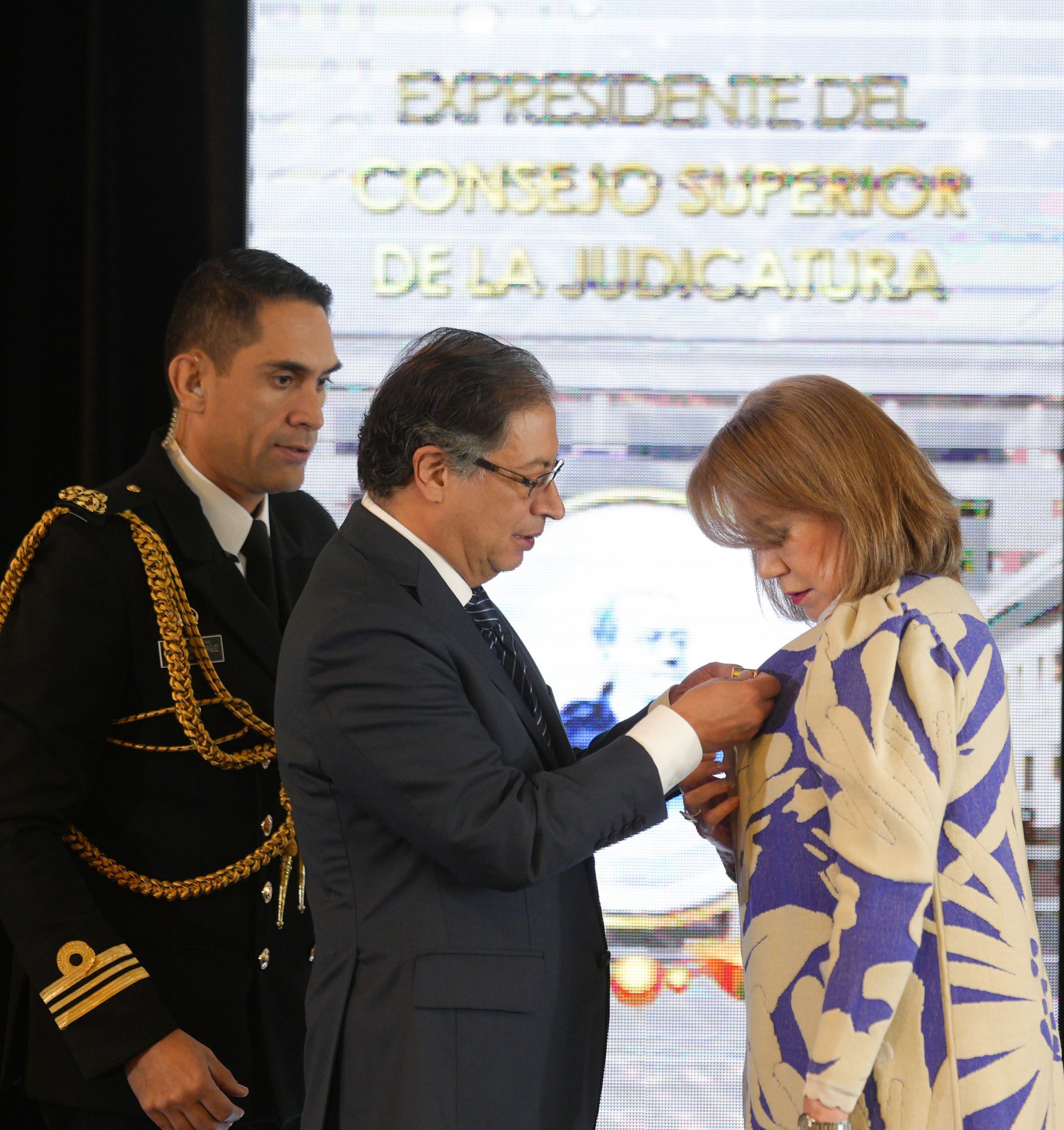 Fueron condecorados, en la categoría oro, la Presidente de la Corte Constitucional, magistrada Cristina Pardo Schlesinger; el Presidente de la Corte Suprema de Justicia, magistrado Aroldo Wilson Quiroz Monsalvo; el Presidente del Consejo de Estado, magistrado Carlos Enrique Moreno Rubio; el Presidente del Consejo Superior de la Judicatura, magistrado Jorge Luis Trujillo Alfaro; el Presidente Comisión Nacional de Disciplina Judicial, Diana Marina Vélez Vásquez; el expresidente de la Corte Suprema de Justicia, José Francisco Acuña Vizcaya, y la expresidenta del Consejo Superior de la Judicatura, Martha Lucía Olano Guzmán.