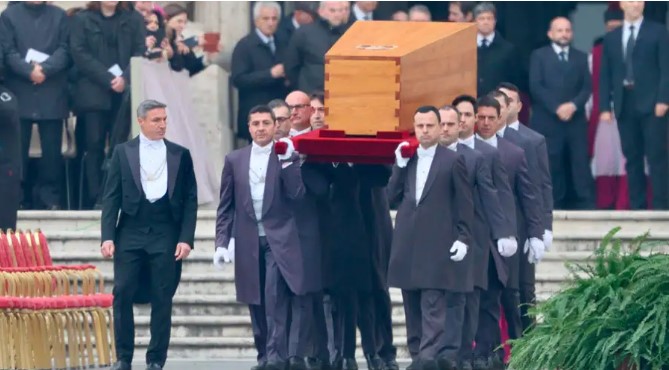 El ataúd de Benedicto XVI es llevado del interior de la Basílica de San Pedro a la Plaza de San Pedro. Crédito Daniel Ibáñez. ACI Prensa