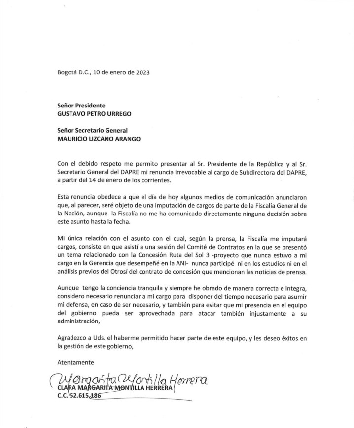Bogotá, 11 enero de 2023_RAM_La subdirectora del Departamento Administrativo de la Presidencia de la República (Dapre), Margarita Montilla, presentó su renuncia al cargo al presidente Gustavo Petro, luego de que la Fiscalía anunciara que será imputada por presuntas irregularidades en la contratación del segundo “puente plato” en la denominada Ruta del Sol III.