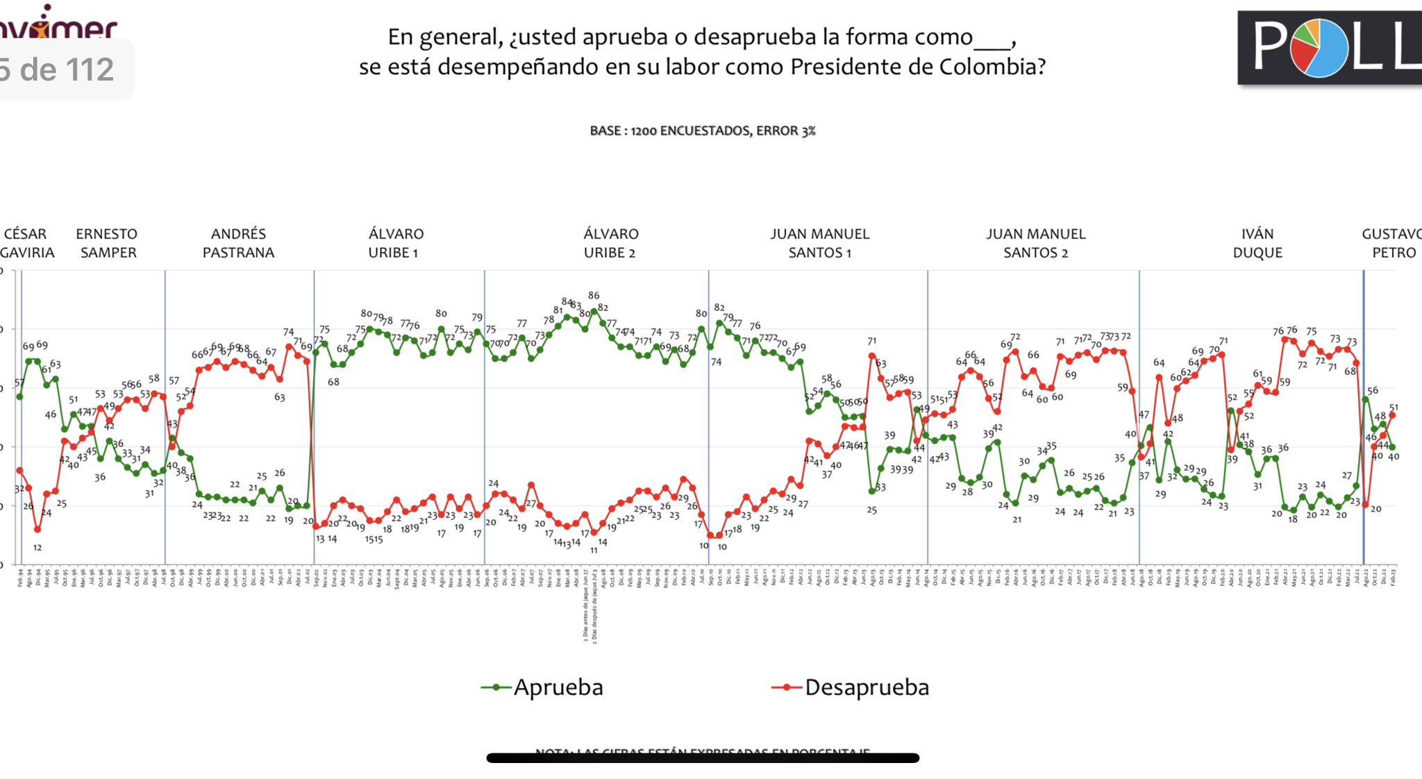 cae 16 puntos en 7 meses, pasa de 56 a 40% de quienes aprueban en Colombia su desempeño, según Invamer Poll