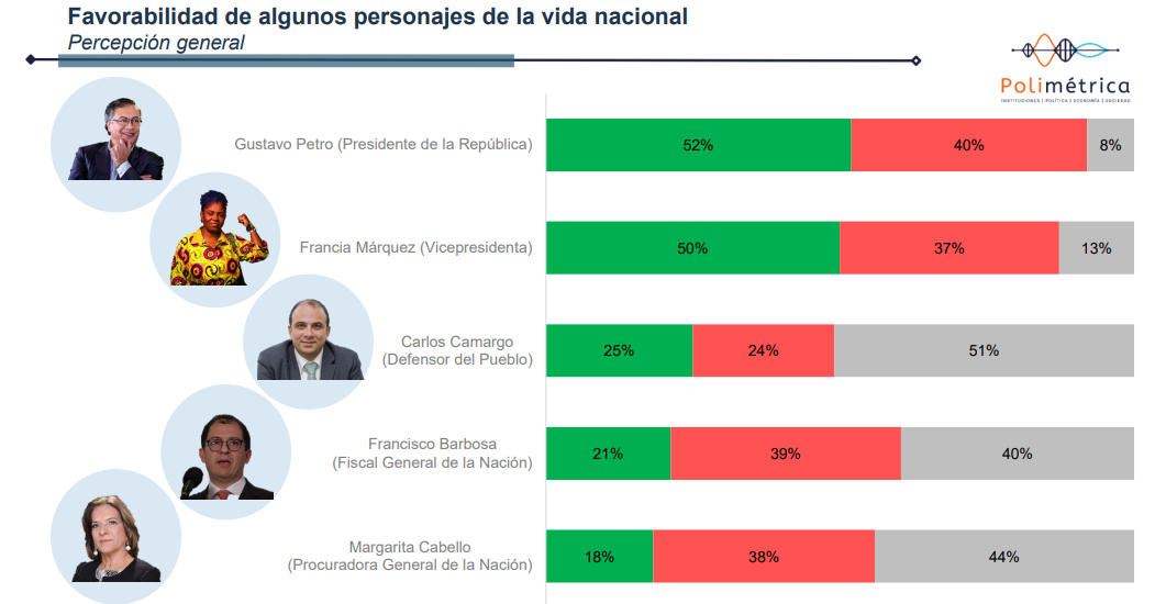 En cuanto a los demás funcionarios del Gobierno, Cifras y Conceptos indicó que los colombianos tienen una imagen favorable de la vicepresidenta de Francia Márquez del 50 %, disminuyendo 10 puntos.