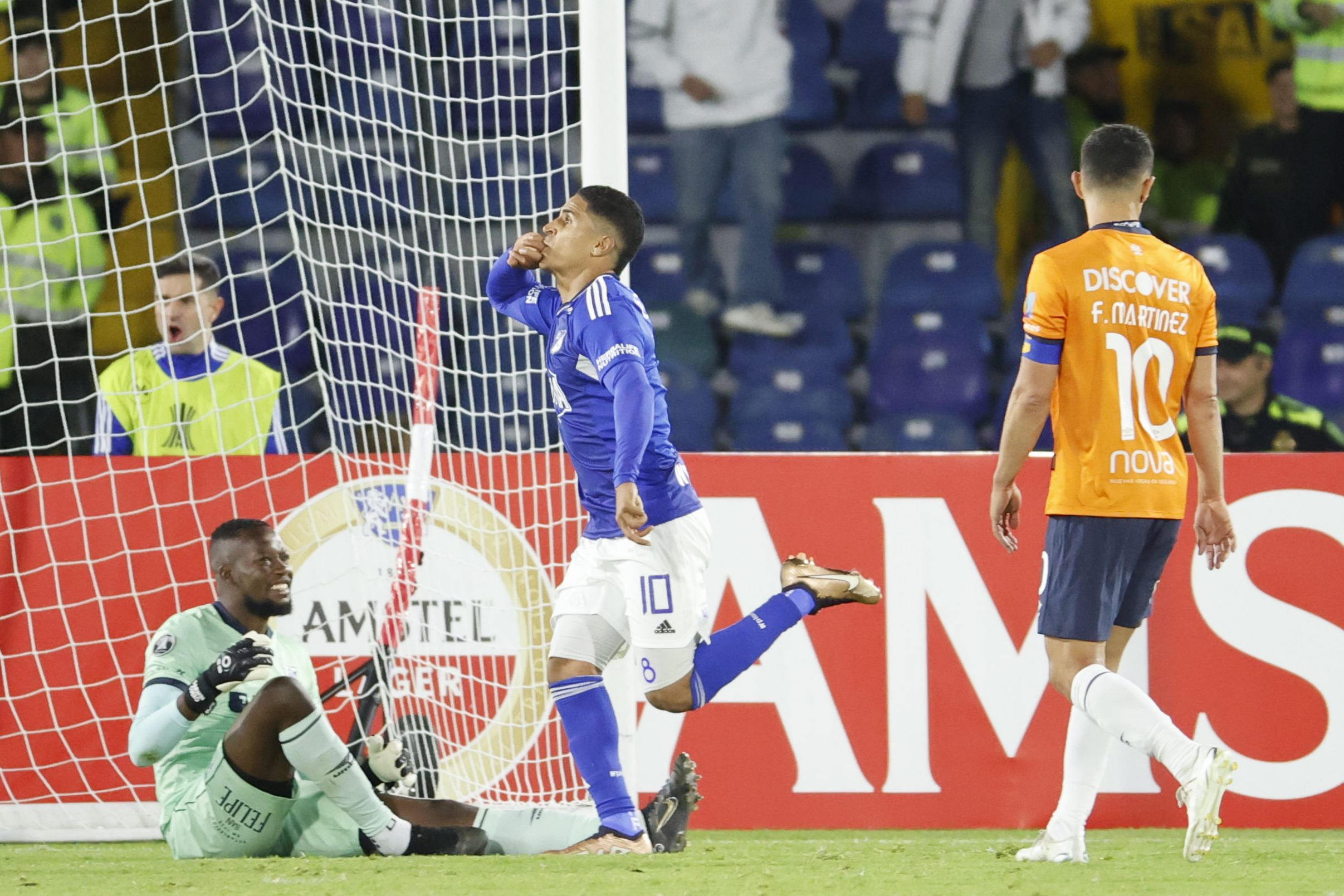 A los 80′ El festejo de Cataño al seguir un gol en el triundo de Millonarios ante la U.Católica de Ecuador. Foto Conmebol