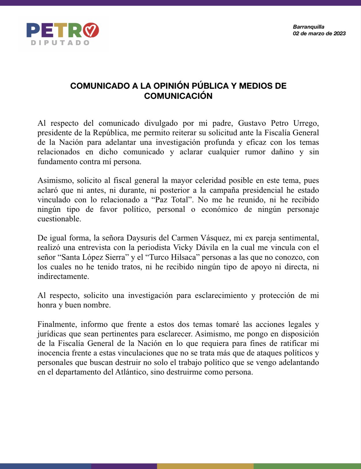 El hijo mayor de Petro, emitió un comunicado respondiendo a dichos señalamientos: «Solicito a la Fiscalía, adelantar una investigación profunda y eficaz son los temas relacionados en dicho comunicado y aclarar cualquier rumor dañino y sin fundamento contra mí persona».