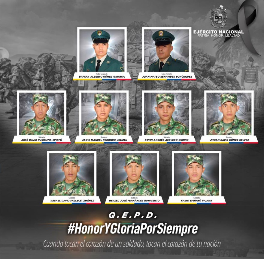 “La institución lamenta profundamente el asesinato de nuestros militares y envía un sentido saludo de condolencias a las familias de: Cabo Segundo Brayan Alberto Gómez Gamboa; Cabo Tercero Juan Mateo Benavides Bohórquez; Soldado Jaime Manuel Redondo Uriana; Soldado Kevin Andrés Acevedo Osorio; Soldado Jhoan David Gómez Gélvez; Soldado Rafael David Fallece Jiménez; Soldado Herzel José Fernández Bonivento; Soldado José David Pushaina Epiayú; Soldado Fabio Epinayú Ipuana.” Señaló el Ejército en el comunicado.