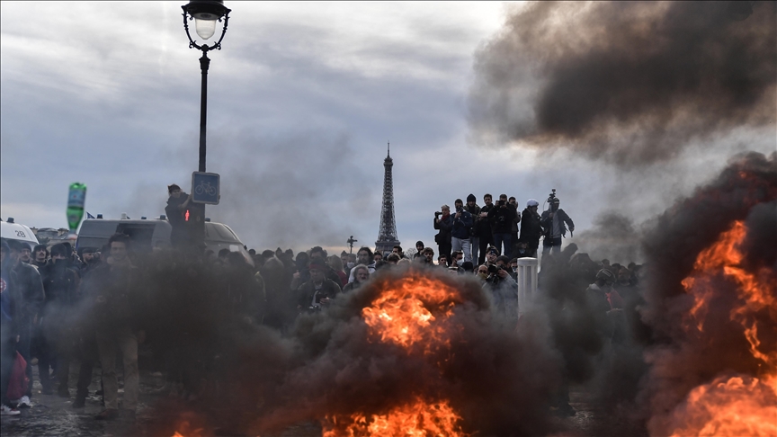 Paris,16 marzo 2023_ Agencia Anadolu _ Las protestas y los enfrentamientos estallaron este jueves 15 de marzo en París, Francia, luego de que el Gobierno usara sus poderes constitucionales especiales para forzar la controvertida reforma pensional sin el consentimiento del Parlamento.