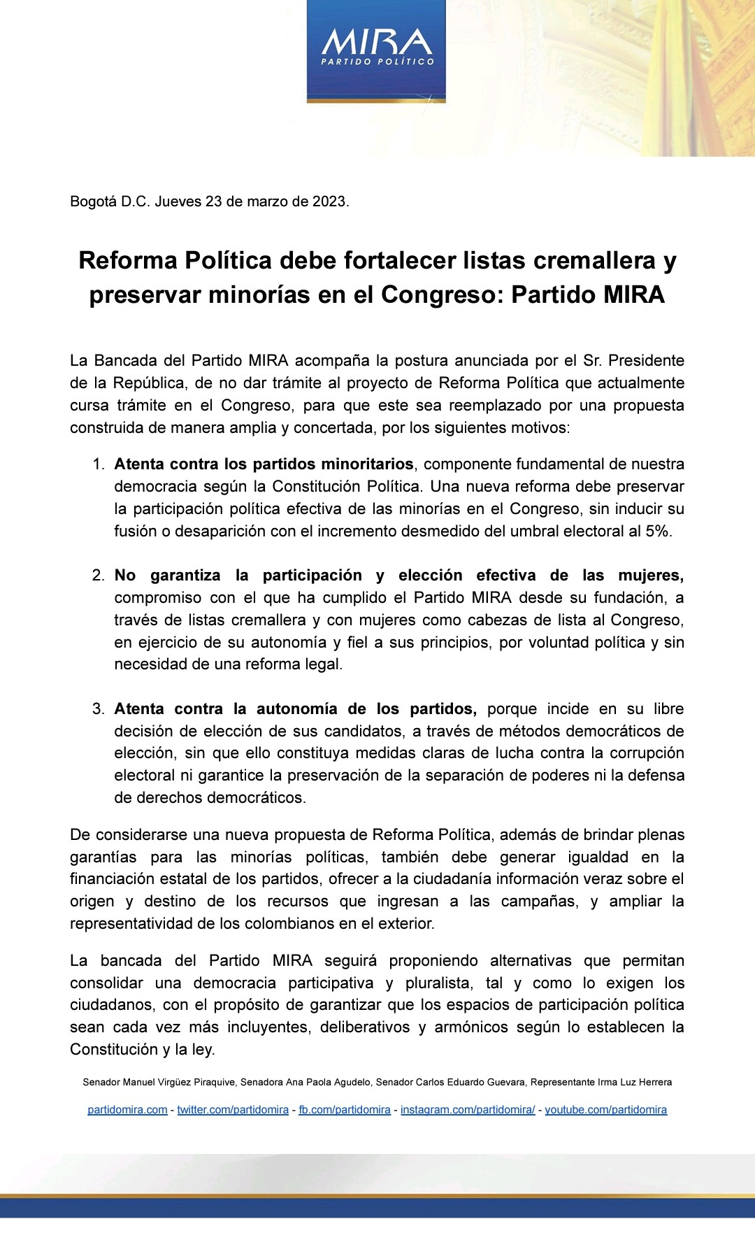Por su parte, la congresista Katherine Miranda indicó que seguirán haciendo control político riguroso, luego de firmar una carta junto a demás parlamentarios, donde le piden al Gobierno nacional archivar la reforma política.