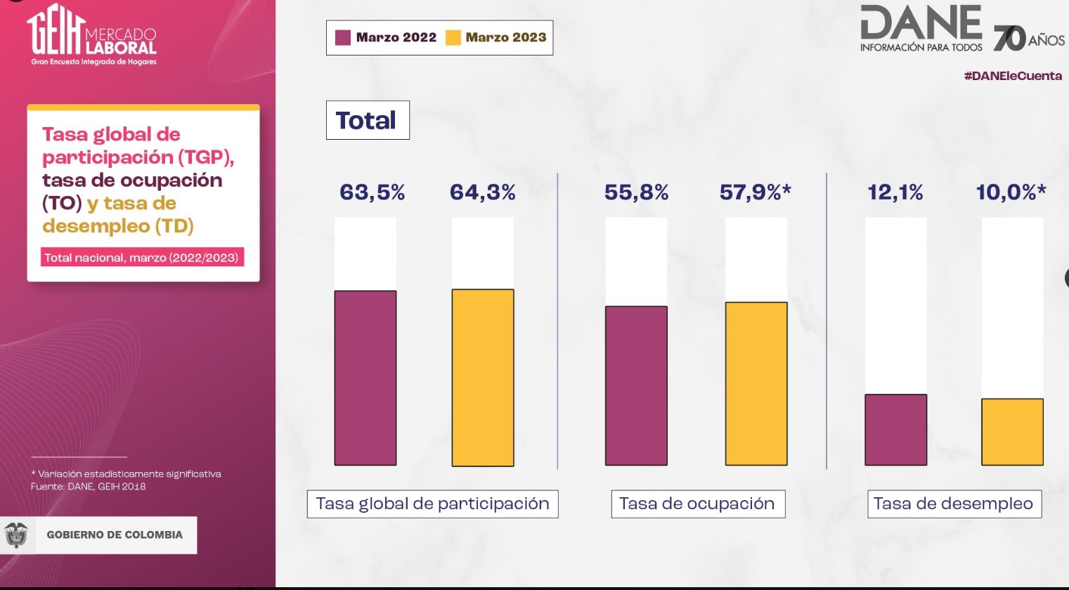 Bogotá, 28 abril, 2023_RAM_El Departamento Administrativo Nacional de Estadística (DANE) informó que en marzo de 2023 la tasa de desempleo fue 10%, que representa una reducción de 2,1 puntos porcentuales (p.p.), frente al mismo mes del 2022, cuando se ubicó en 12,1%.