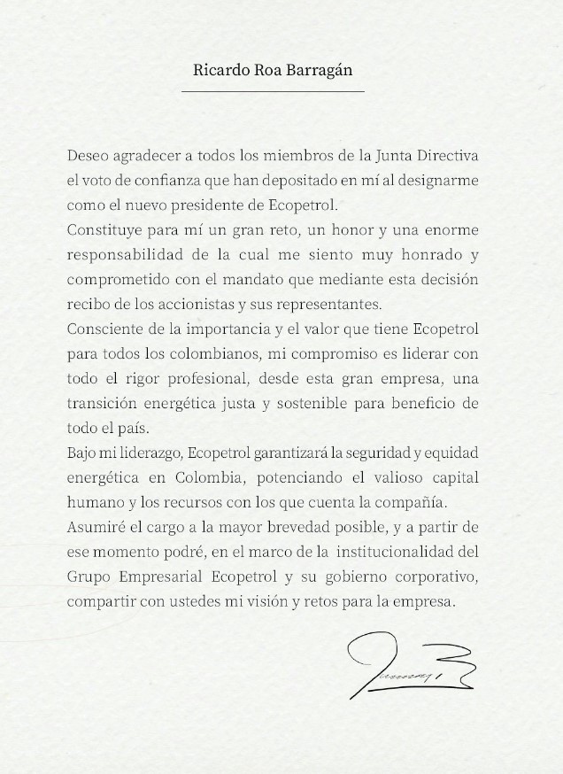 Ecopetrol S.A. (BVC: ECOPETROL; NYSE: EC) informa que su Junta Directiva, en sesión del 11 de abril de 2023, designó como Presidente de Ecopetrol S.A. a Ricardo Roa Barragán, quien asumirá el cargo a más tardar el 30 de abril de 2023.