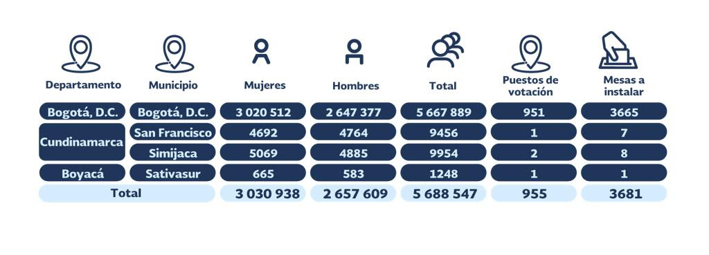 De los 5 688 547 colombianos habilitados para ejercer su derecho al voto durante las consultas populares e interpartidistas que se celebrarán el domingo 4 de junio de 2023 en Bogotá, D.C.; San Francisco y Simijaca (Cundinamarca) y Sativasur (Boyacá), 3 030 938 son mujeres y 2 657 609 son hombres, quienes podrán sufragar en 3681 mesas, distribuidas en 955 puestos de votación.