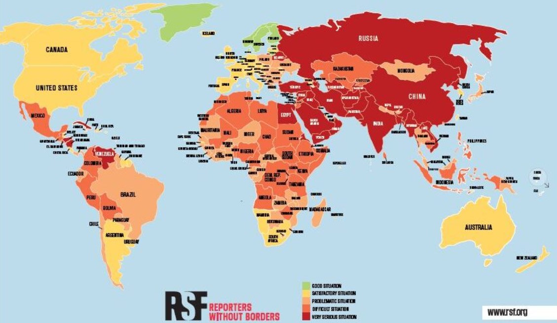 Reporteros sin Fronteras publicó su Índice mundial sobre la Libertad de Prensa en 2023 en el que divide 180 países en cinco grupos: situación buena (8 países), situación más bien buena (44 países), situación problemática (55 países), situación difícil (42 países) y situación muy grave (31 países).