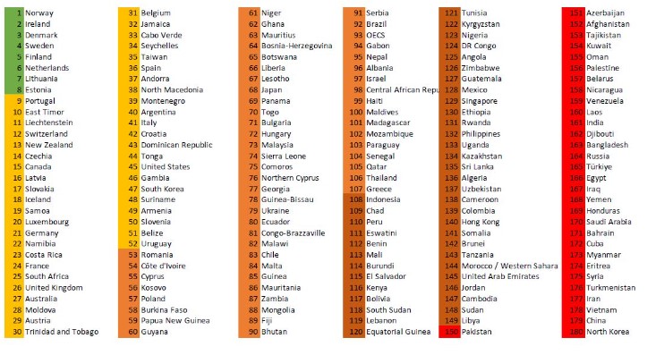 A nivel global, los países con la mejor situación de prensa son Noruega (1), Irlanda (2) y Dinamarca (3) mientras que las naciones con la situación más grave son Corea del Norte (180), China (179) y Vietnam (178).
