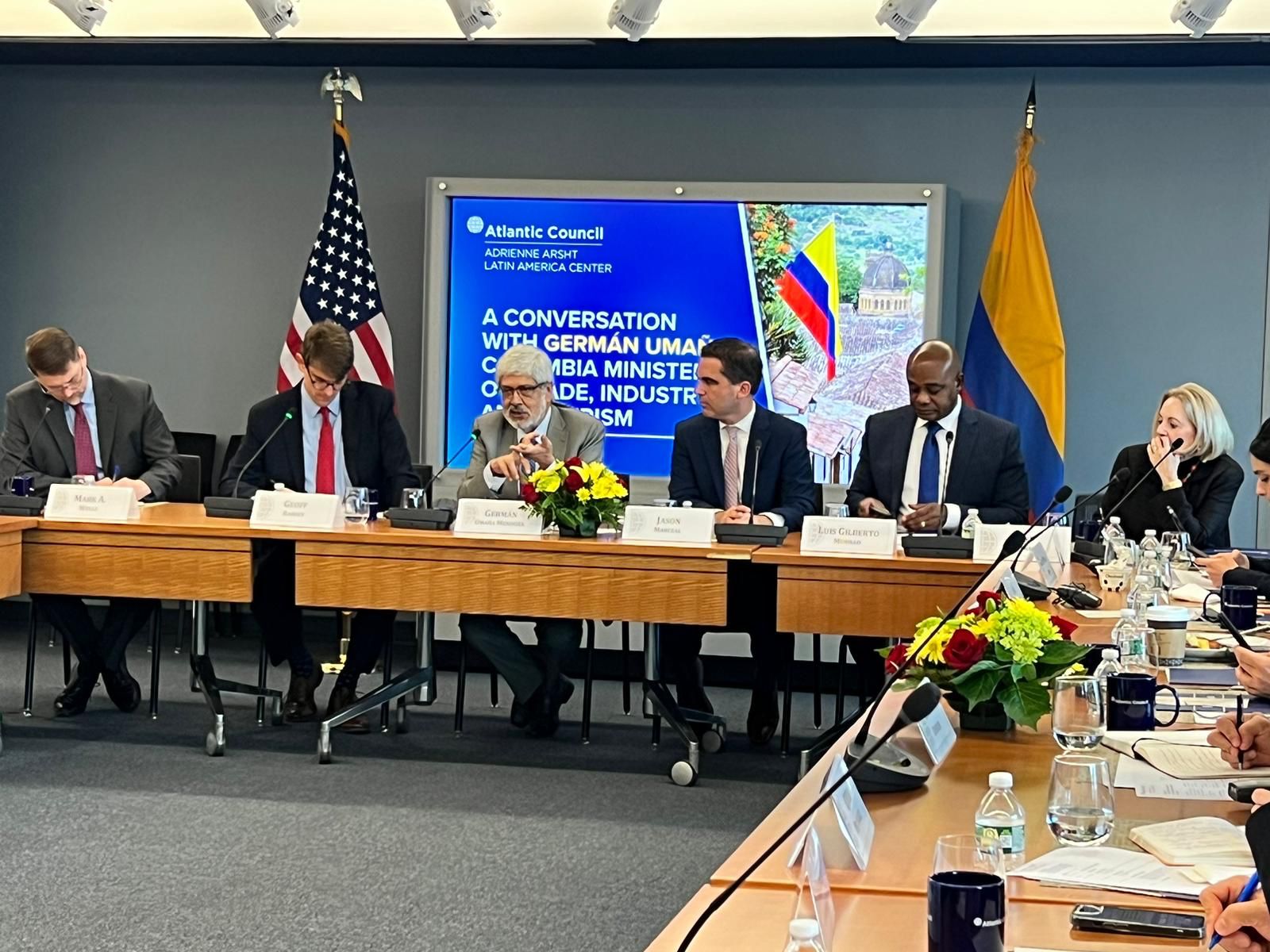 Igualmente, sostuvo un encuentro con el grupo asesor del centro de pensamiento Atlantic Council, integrado por ex embajadores de Estados Unidos en Colombia, calificadoras de riesgo, consultores y empresarios, durante el cual reiteró la necesidad de atraer inversión que genere transferencia de tecnología, encadenamientos productivos regionales y generación de capacidades humanas.