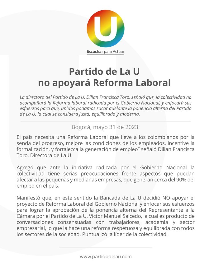 «La colectividad no acompañará la Reforma laboral radicada por el Gobierno Nacional, y enfocará sus esfuerzos para que, unidos podamos sacar adelante la ponencia alterna del Partido de La U, la cual se considera justa, equilibrada y moderna», dice el comunicado.