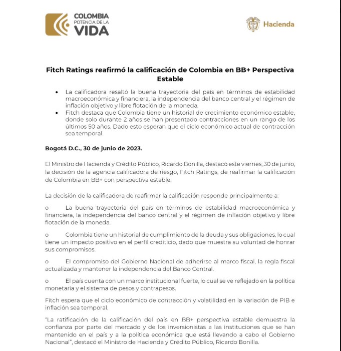 Bogotá, 30 junio, 2023_RAM_El Ministro de Hacienda y Crédito Público, Ricardo Bonilla, destacó este viernes, 30 de junio, la decisión de la agencia calificadora de riesgo, Fitch Ratings, de reafirmar la calificación de Colombia en BB+ con perspectiva estable.