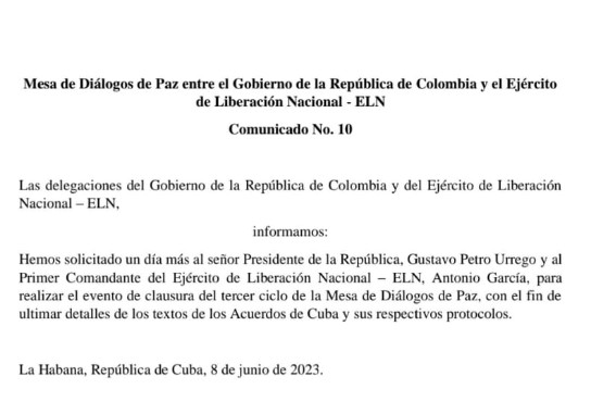 La instancia negociadora solicitó este tiempo al presidente de Colombia Gustavo Petro y al Primer comandante del ELN Antonio García, con el propósito de ultimar detalles de los textos de los Acuerdos de Cuba y sus respectivos protocolos, sostiene el comunicado número 10 de las partes.