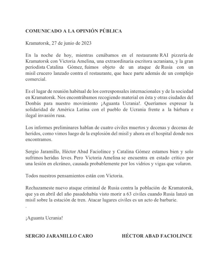 “Sergio Jaramillo, Héctor Abad Faciolince y Catalina Gómez estamos bien y solo sufrimos heridas leves. Pero Victoria Amelina se encuentra en estado crítico por una lesión en el cráneo, causada probablemente por vidrios y vigas que volaron”, indica el comunicado.