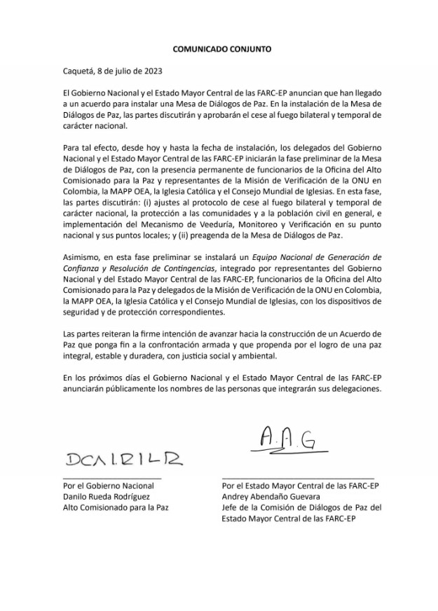 “En esta fase, las partes discutirán: ajustes al protocolo de cese al fuego bilateral y temporal de carácter nacional y protección de la población civil, e implementación de mecanismos de veeduría, monitoreo y de verificación, en su punto nacional y sus puntos locales. Pre agenda de la mesa de diálogos de paz. Metodología de la mesa itinerante, y finalmente mecanismos de participación de la sociedad civil”, señala el comunicado conjunto entre el Gobierno y las disidencias de «Iván Mordisco».