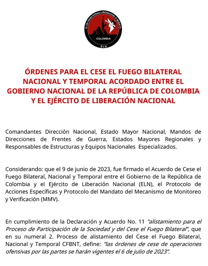A través de un comunicado publicado en la página de la guerrilla, el ELN confirmó que tras un acuerdo con el Gobierno Nacional en medio de los diálogos de paz ordena que “a partir de las 00 horas del 6 de julio, hasta las 00 horas de 3 de agosto de 2023, las estructuras del Ejército de Liberación Nacional deben cesar todas las acciones militares ofensivas contras las Fuerzas Militares y de Policía en todo el territorio nacional, incluyendo las acciones de inteligencia”.