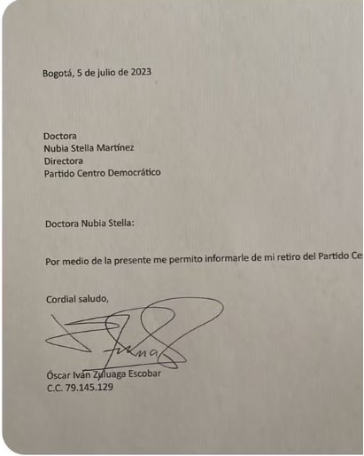 En el documento dirigido a la presidenta del partido, Nubia Stella, se puede leer: “por medio de la presente me permito informarle mi retiro del partido Centro Democrático”.