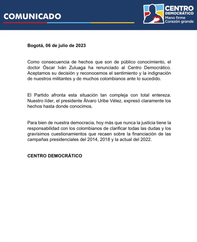 “Como consecuencia de hechos que son de conocimiento público, el doctor Óscar Iván Zuluaga ha renunciado al Centro Democrático. Aceptamos su decisión y aceptamos el sentimiento y la indignación de nuestros militantes y de muchos colombianos ante lo sucedido”, aseguraron en el comunicado.