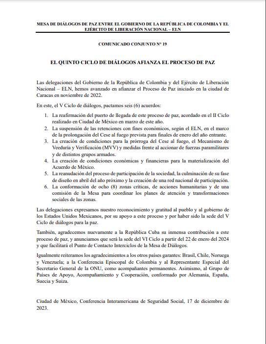 También, añade, agradecemos nuevamente a la República Cuba su inmensa contribución a este proceso de paz, y anunciamos que será la sede del VI Ciclo a partir del 22 de enero del 2024 y que facilitará el Punto de Contacto Interciclos de la Mesa de Diálogos.