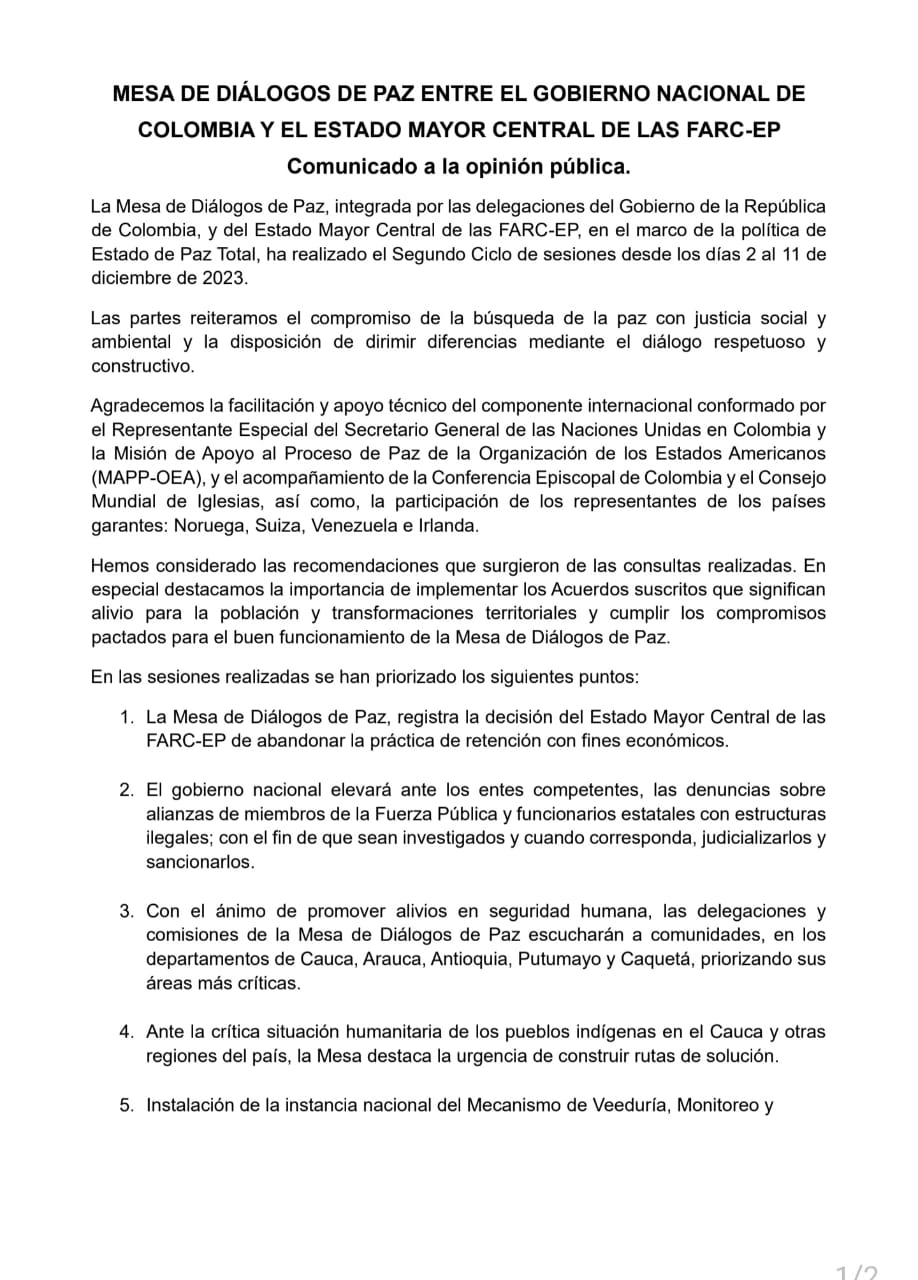 Bogotá, 12 diciembre, 2023_RAM_En medio de las conversaciones de paz entre el Gobierno colombiano y el Estado Mayor Central de las Farc, grupo que lidera alias ‘Iván Mordisco’, las partes han adelantado unas sesiones privadas y han priorizado temas fundamentales para el avance del proceso de paz.
