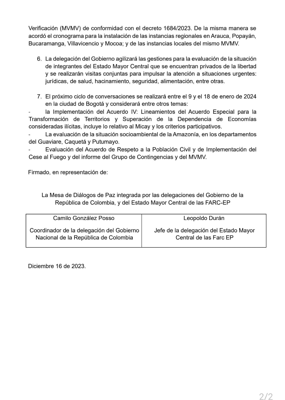 Las partes también acordaron que el próximo ciclo de conversaciones de paz se realizará en Bogotá entre el 9 y el 18 de enero del 2024 en el cual se abordarán otros temas como la implementación del Acuerdo IV: Lineamientos del Acuerdo Especial para la Transformación de Territorios y Superación de la Dependencia de Economías consideradas ilícitas, incluye lo relativo al Micay y los criterios participativos.