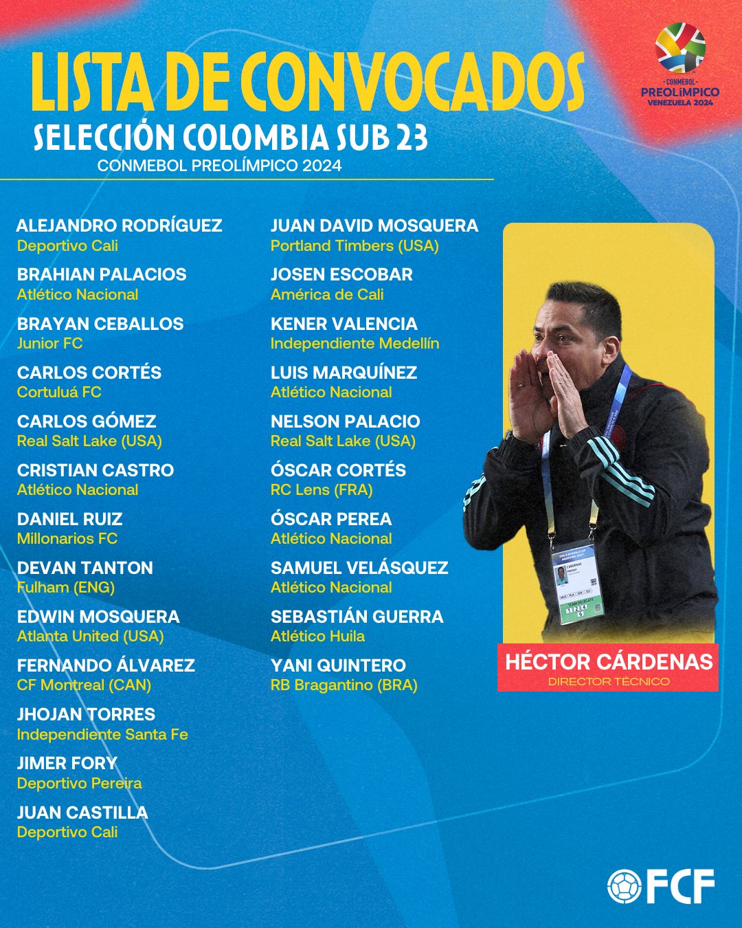 Bogotá, 05 enero, 2024_RAM_ Héctor Cárdenas dio a conocer la lista de los 23 jugadores convocados al Torneo Preolímpico que disputará la Selección Colombia Sub-23 en Venezuela. Este certamen tendrá lugar del 20 de enero al 11 de febrero y otorgará dos cupos hacia los Juegos Olímpicos de París 2024 (26 de julio al 11 de agosto).