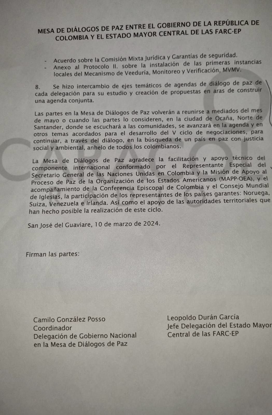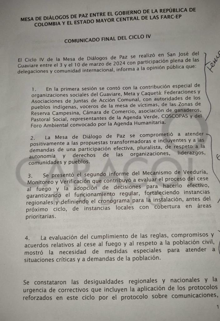 San José del Guaviare, 10 marzo 2024_RAM_Durante el cuarto ciclo de la mesa de diálogos de paz entre el gobierno y el Estado Mayor Central, las partes negociadoras llegaron a un acuerdo de ocho puntos.
