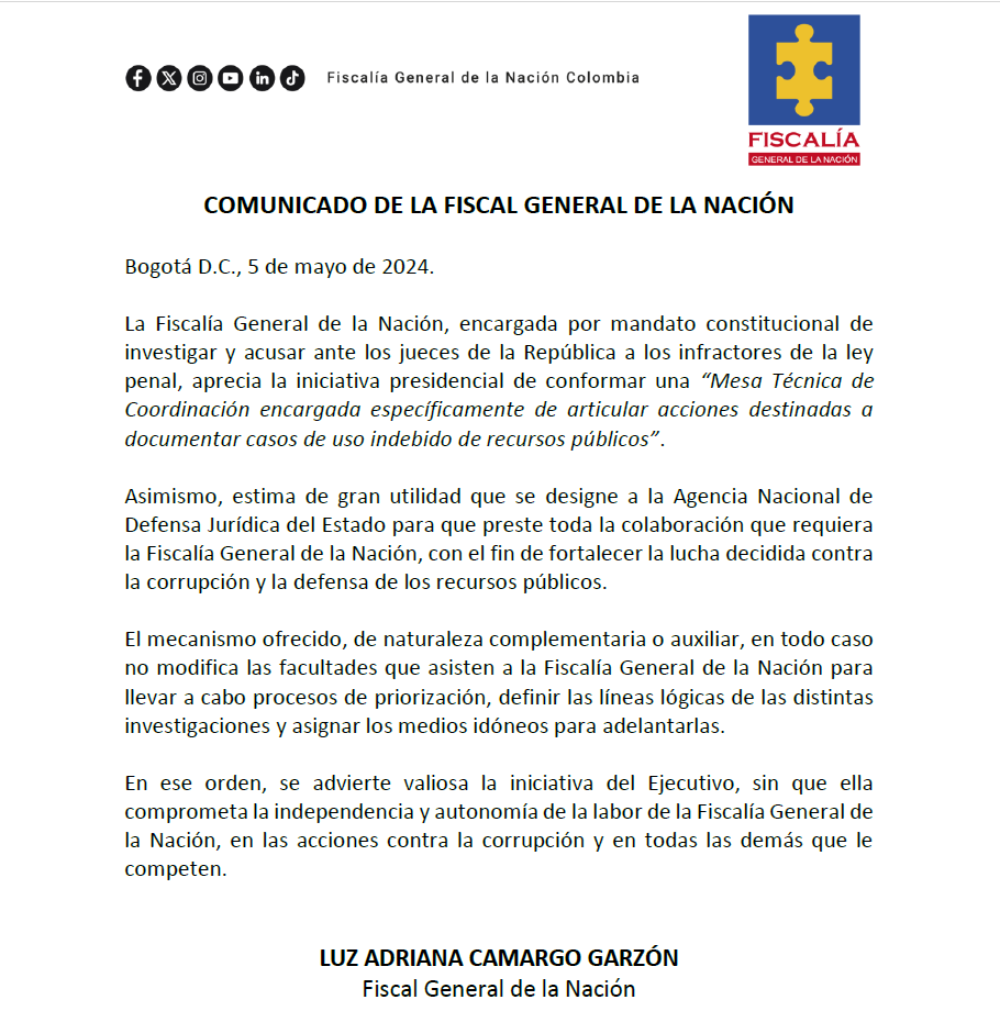 Bogotá, 05 mayo 2024_RAM La Fiscalía General de la Nación celebró la creación de la Mesa Técnica de Coordinación para indagar sobre los casos de posible corrupción. Sin embargo, destacó que este mecanismo propuesto, no compromete la autonomía ni la labor constitucional de investigar y acusar del ente acusador.