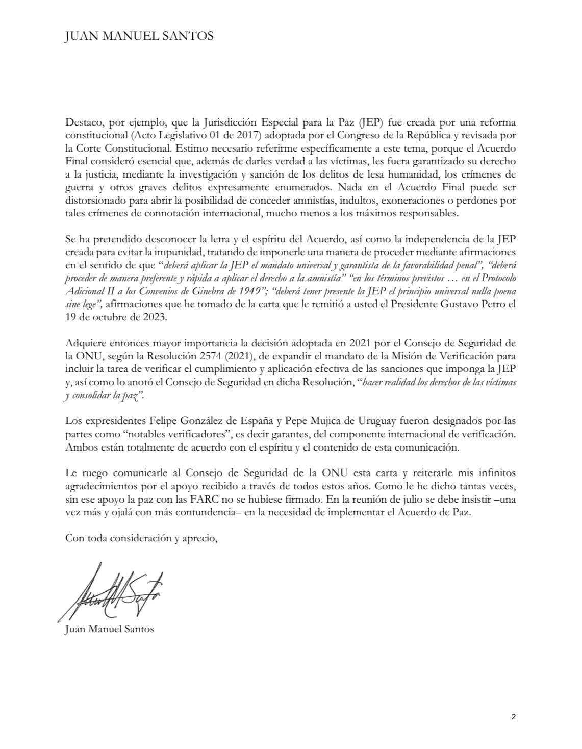 En el documento que fue dirigido al Secretario General de la ONU, Antonio Guterres, también afirma que la creación de la Jurisdicción Especial de Paz se creó para garantizar sanción y justicia para los crímenes de lesa humanidad, no para dar impunidad a los hechos que se cometieron en el marco del conflicto.