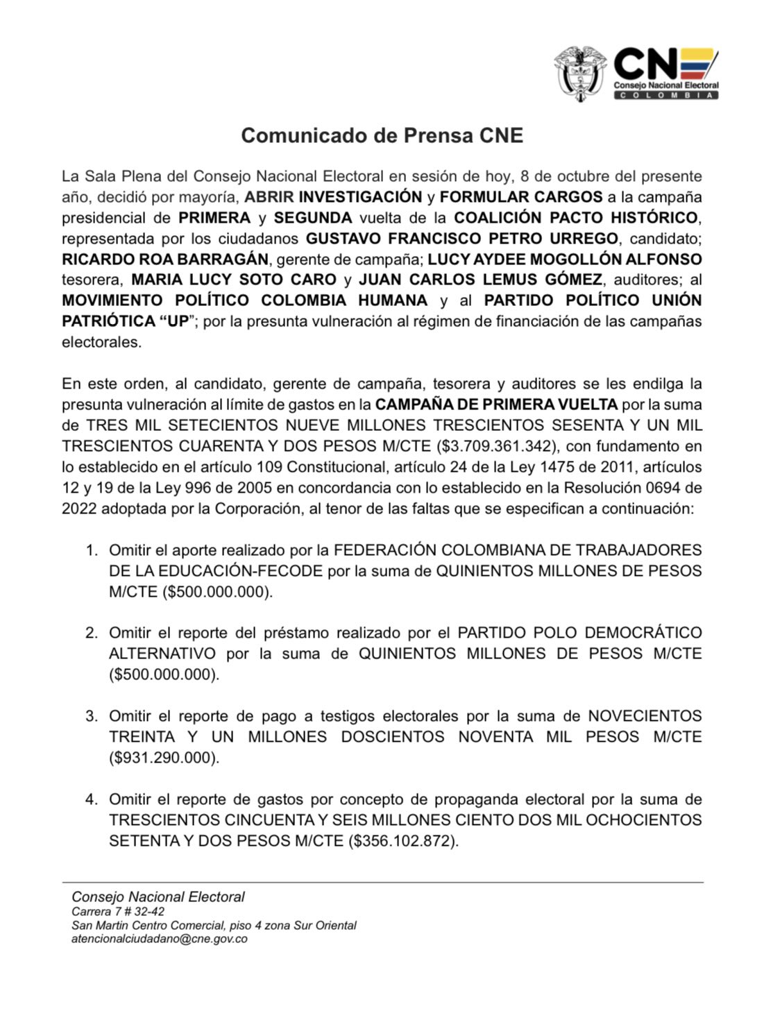 CNE abre investigación formal a campaña ‘Petro Presidente’ y formula cargos
