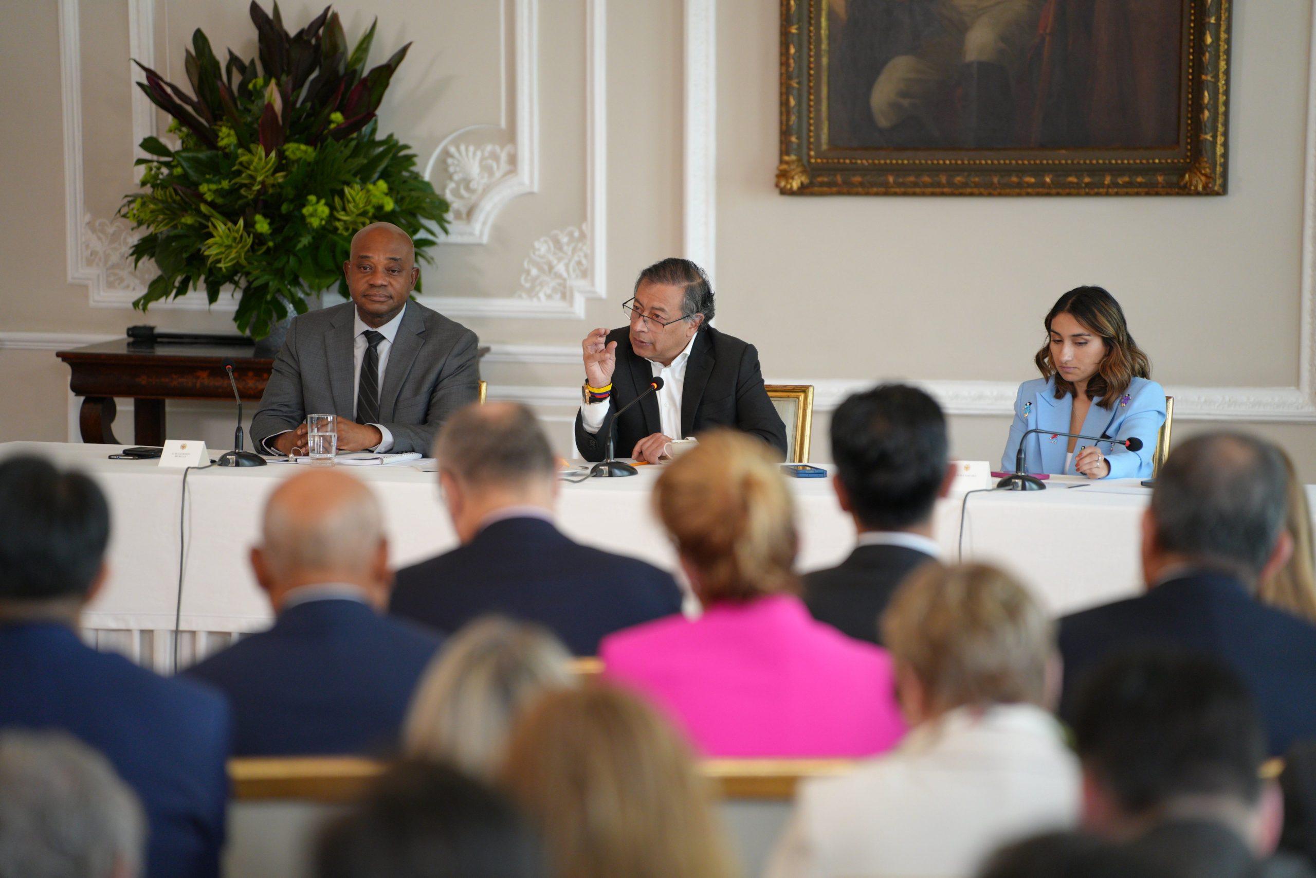 El presidente Gustavo Petro y parte de su gabinete se reunieron con 73 delegaciones de distintos países y de los organismos internacionales. Foto: Presidencia