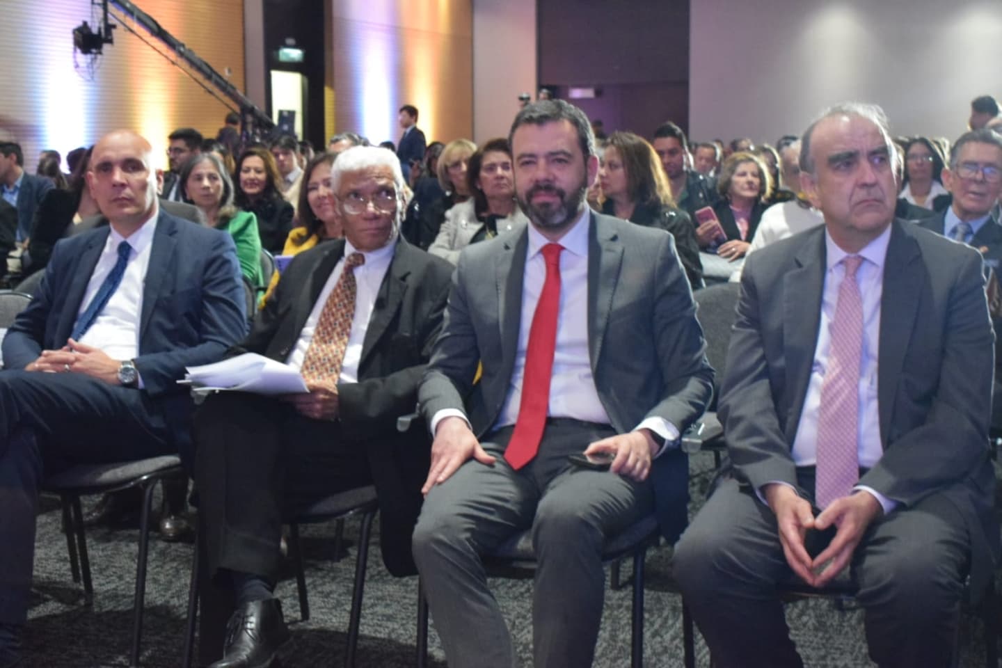 José María Bolaño, presidente del CPB, el alcalde de Bogotá Carlos Fernando Galán y el director del Diario el Espectador y miembro del jurado calificador, Fidel Cano, durante la ceremonia del Premio Nacional de Periodismo del Círculo de Periodistas de Bogotá